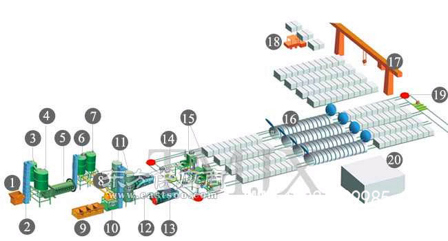 其工藝流程包括:原料處理,配料、加水攪拌,入倉消解,強制輪混,壓制成型,蒸壓養護,下面簡單介紹一下: