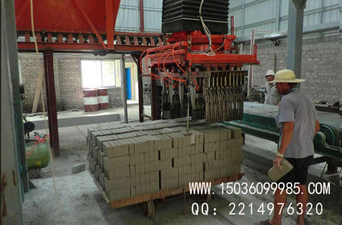 3、磚坯成型:磚坯成型系統由皮帶輸送機和液壓磚機和自動碼坯機組成。經輪碾后的混合料用皮帶輸送機送入壓磚機的給料機構,并壓制成型。