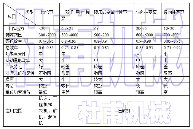 一般負載小、功率小的液壓磚機,可用齒輪泵或雙作用式定量葉片泵;精度較高的中、小功率的液壓磚機,可用雙作用式定量葉片泵(如磨床):負載較大并有快速和慢速工作行程的液壓磚機(如組合機床等)可選用 限壓式變量葉片泵,負載大,功率大的液壓磚機,可選用徑向柱塞泵或軸向柱塞泵:壓磚機設備輔助裝置的液壓系統,如送料、定位、夾緊、轉位等裝置的液壓系統,可選用造價低的齒輪泵。