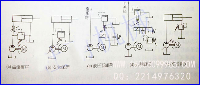 A.調壓溢流 系統采用定量泵供油的節流調速時,常在其進油路或回油路上設置節流閥或調速閥,使泵油的一部分進入液壓缸工作,而多余的油需經溢流閥流回油箱。溢流閥處于其調定壓力下的常開狀態,調節彈簧的預緊力,也就調節了系統的工作壓力。因此,在這種情況下溢流閥的作用即為溢流調壓,如圖a所示。